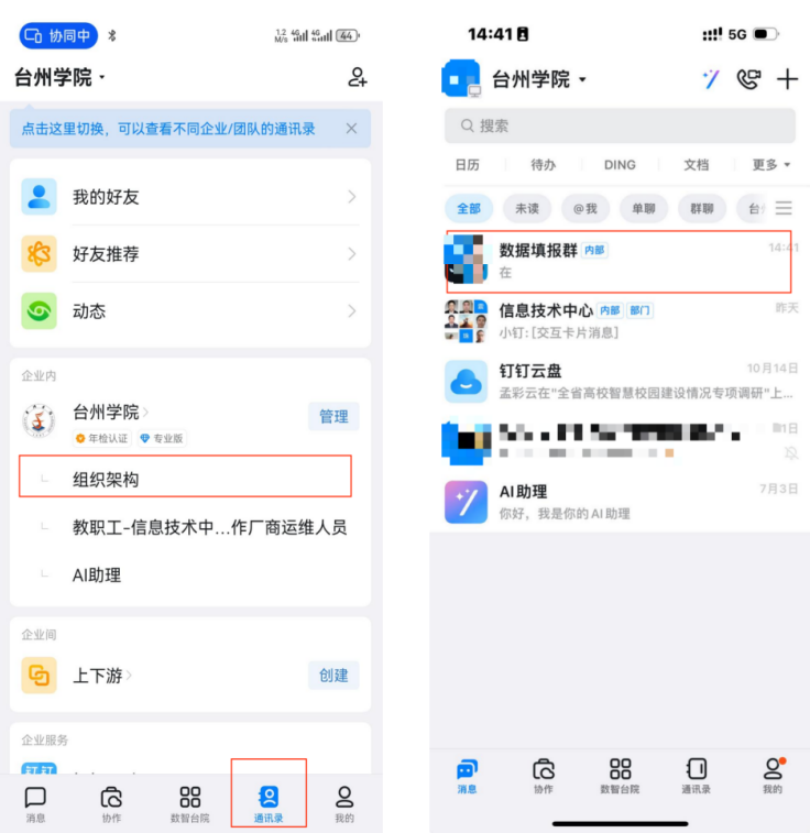 1.学校通过钉钉推送团队邀请消息,邀请各位师生加入钉钉“台州学院”组织,在钉钉“消息”界面中出现“团队邀请”提醒。