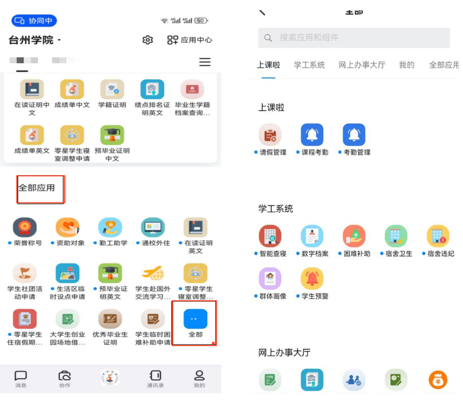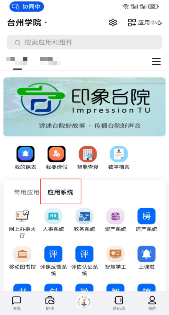 应用系统版块以系统形式集成了“上课啦”“台院学工”“OA”“网上办事大厅”“人事系统”“教务系统”等应用系统。
