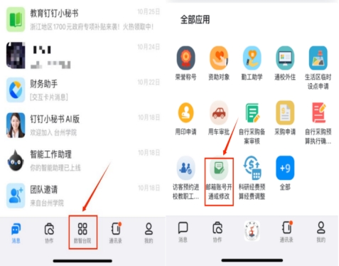 2.钉钉移动端:工作台“数智台院”,找到应用“邮箱账号开通或修改”,参照PC端方法申请。