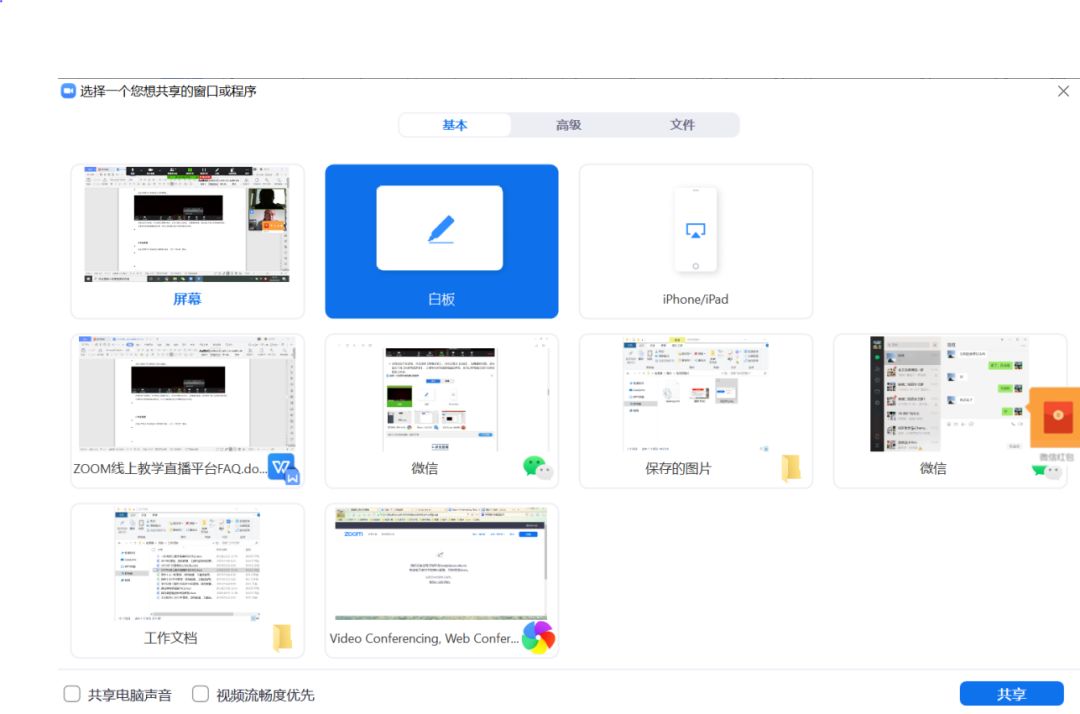 会弹出如下对话框,可以选择【屏幕共享】,也可以调出【白板】,如需播放视频,请勾选左下角【共享电脑声音】,以便学生听到视频播放的声音,还可以将电脑已经打开的应用进行共享。