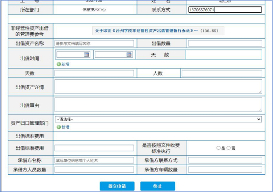 须由承办部门通过网上办事大厅的“台州学院非经营性资产出借审批”流程申请。