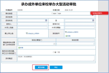 须由承办部门通过网上办事大厅的“承办或外单位来校举办大型活动审批”流程申请。