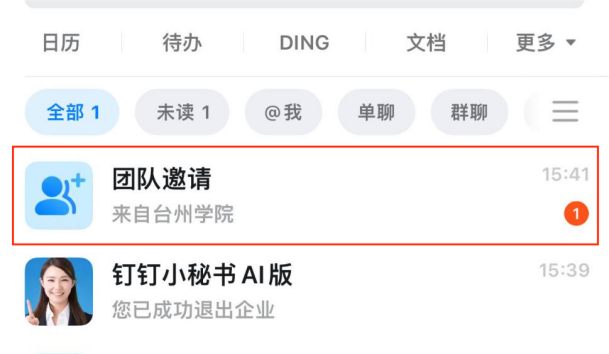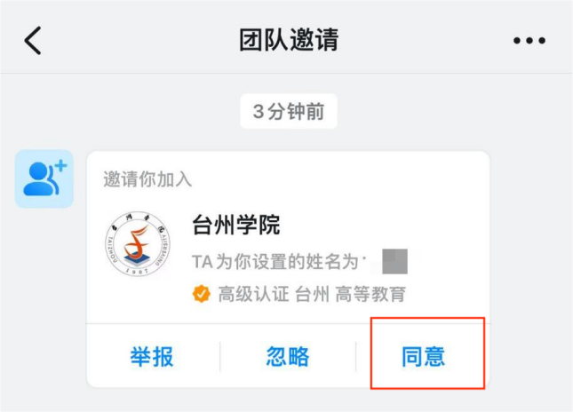 1.学校通过钉钉推送团队邀请消息,邀请各位师生加入钉钉“台州学院”组织,在钉钉“消息”界面中出现“团队邀请”提醒。