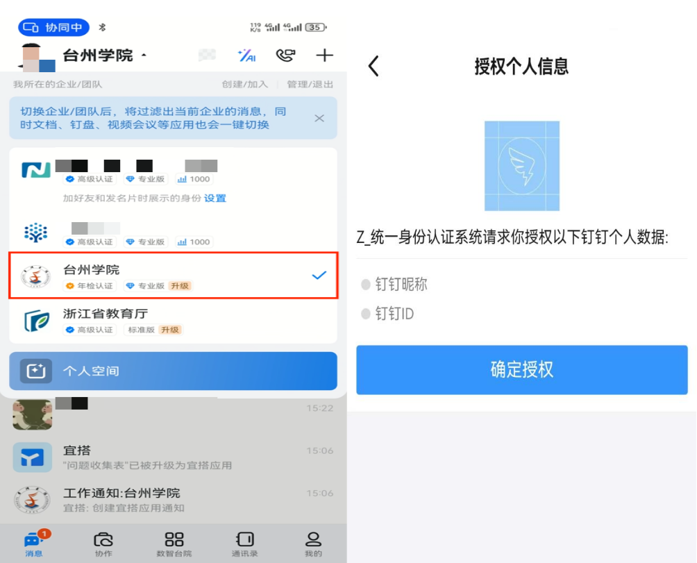 确保选中企业为学校台州学院,在钉钉的“消息”界面,点击上方名字缩写的右边,出现“我的组织”界面,选择学校名称,只有当组织为台州学院时,才能使用我校校园移动门户。首次登录应用需要授权个人信息。