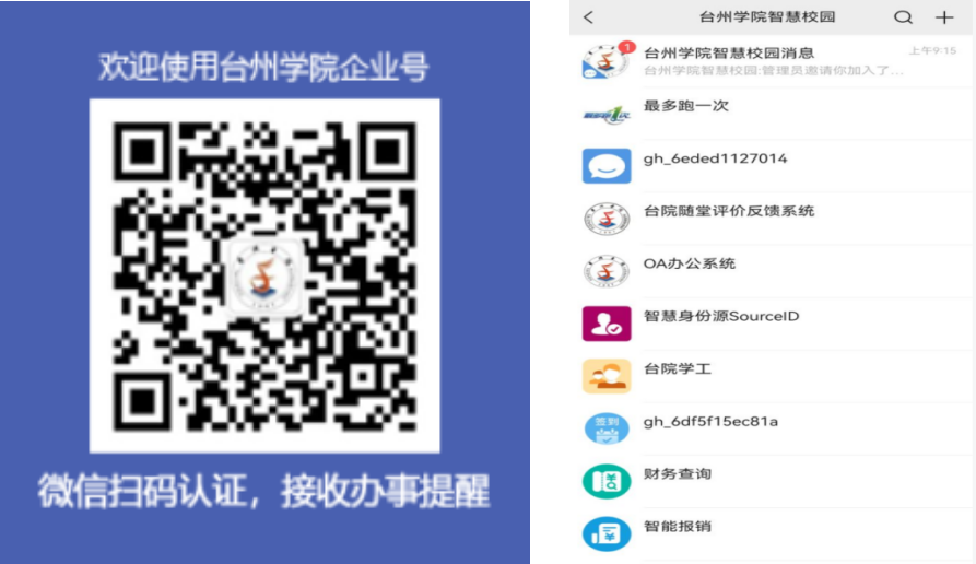 1.微信扫码关注台州学院微信企业号。如果关注认证后正常显示如下应用列表即为成功关注。