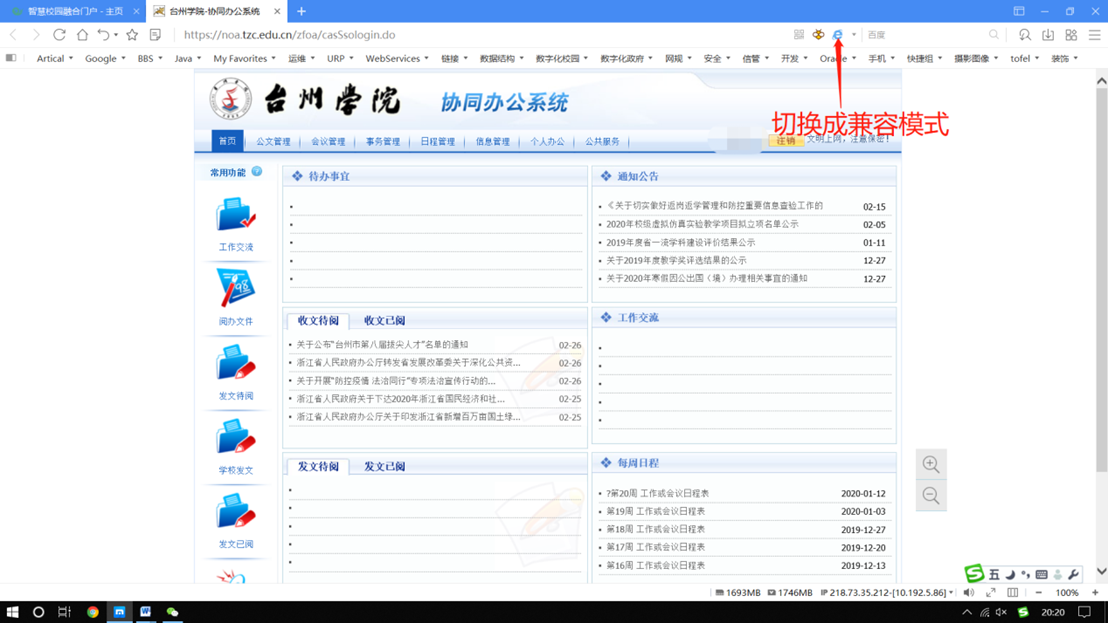 1.直接点击“OA系统”,跳转到统一身份认证登录界面,输入用户名和密码登录,进入OA系统后切换成兼容模式,收文和发文功能可正常使用;